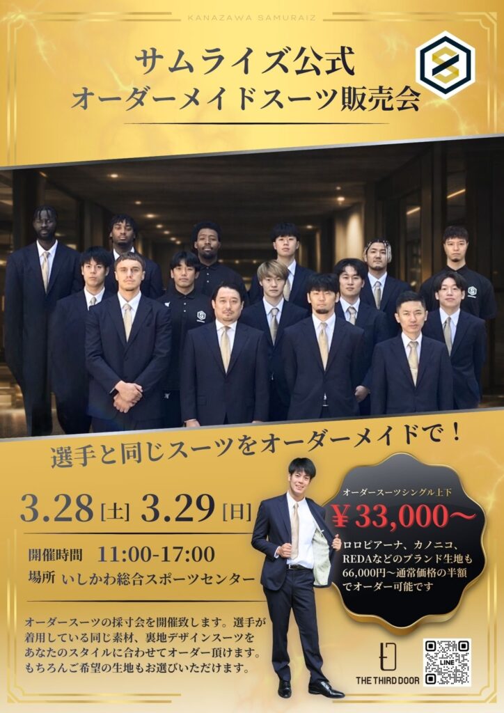 プロバスケットボールチーム「金沢サムライズ」と「THE THIRD DOOR」による、公式オーダースーツの採寸・販売会を2日間限定で開催いたします。